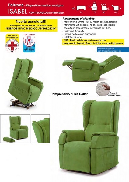 La poltrona Isabel è un presidio medico sanitario. Grazie ai suoi braccioli facilmente rimovibili, facilità la seduta anche a persone con difficolta di deambulazione. In particolare si può passare facilmente da una sedia a rotelle o da un letto direttamente alla poltrona.